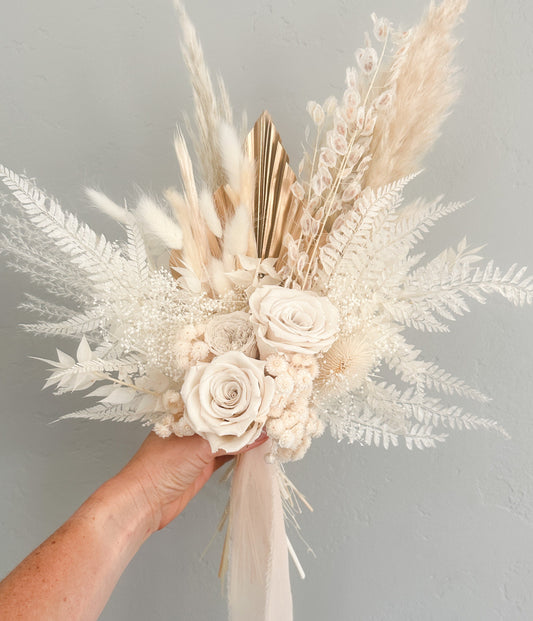 Small White Rose + Gold Palm Pampas Grass Bouquet/ Bride and Bridesmaids/ Dried Flower Bouquet/ Wedding Flowers