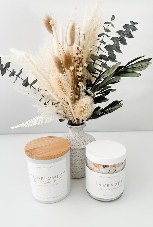 Spring Floral Inspired Seasonal Gift Box with Candle, Bath Salts and Small Dried Flower Arrangement