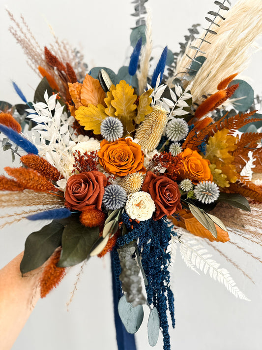 Burnt Orange, Rust + Navy Dried Flower Pampas Grass Bouquet/ Bride and Bridesmaids/ Dried Flower Bouquet/ Wedding Flowers