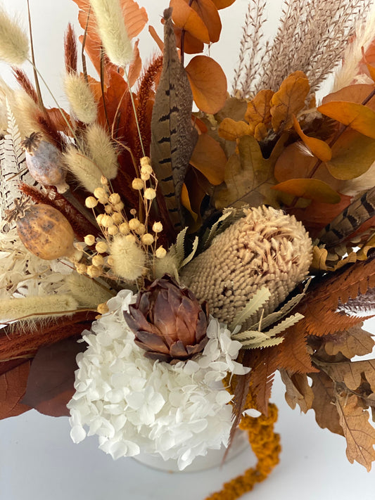 Fall Leaf and Pheasant Feather Dried Flower Bud Vase Centerpiece