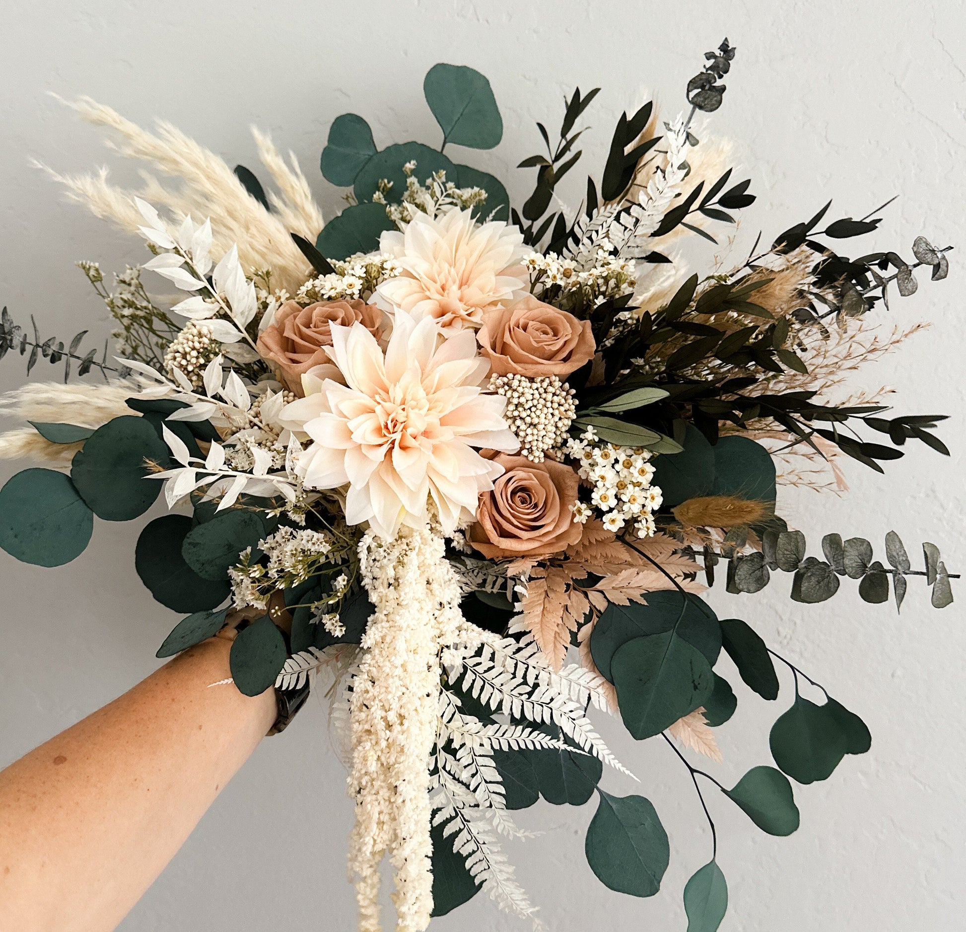 Blush Dahlia, Nude Rose + Greenery Dried Floral Bouquet with Silk Faux Dahlias/ Wedding Flowers/ Bride and Bridesmaids Bouquets