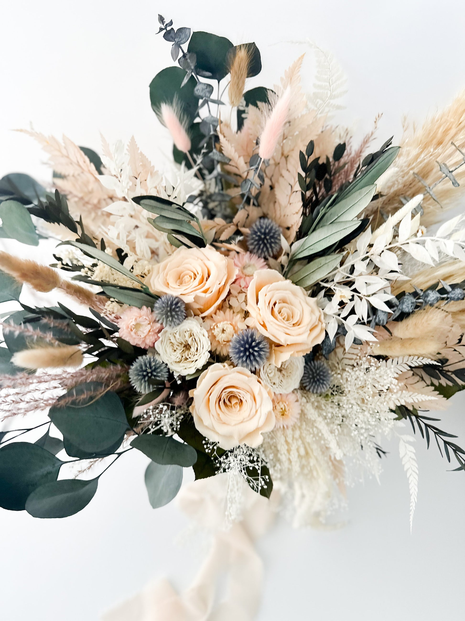 Dried everlasting bouquet including pampas grass, preserved roses, eucalyptus, olive, straw flower, bunny tail grass. Perfect bridal bouquet, bridesmaids bouquet, or place in vase for home decor. Hand tied with silk chiffon ribbon.