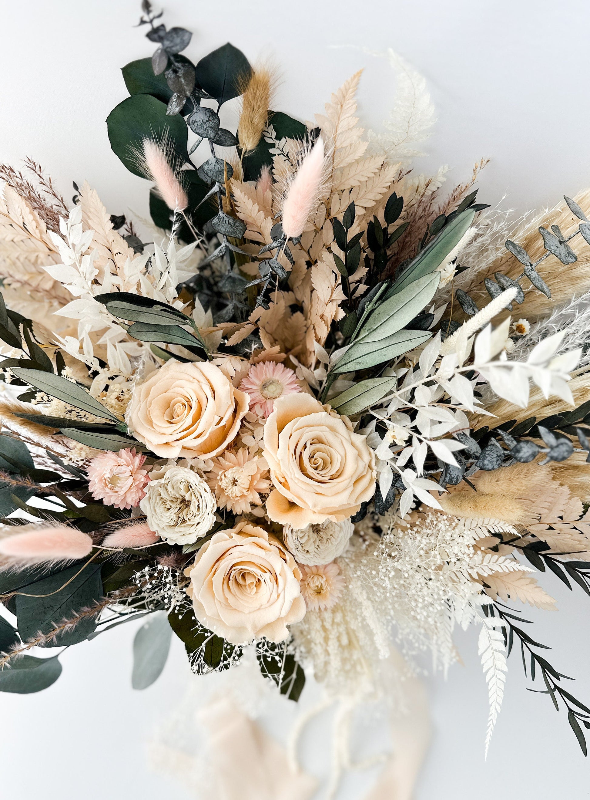 Dried everlasting bouquet including pampas grass, preserved roses, eucalyptus, olive, straw flower, bunny tail grass. Perfect bridal bouquet, bridesmaids bouquet, or place in vase for home decor. Hand tied with silk chiffon ribbon.