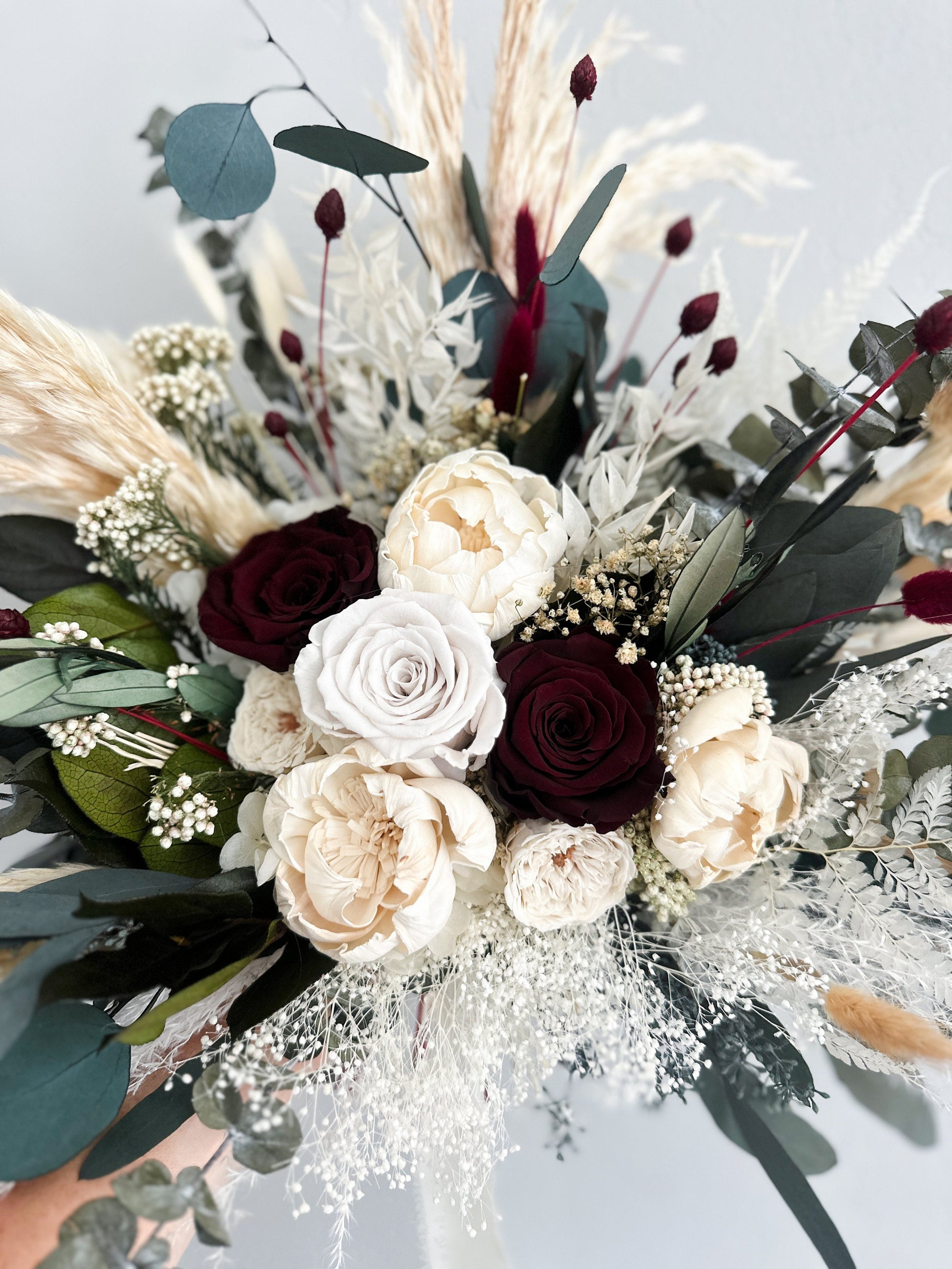 Cream Peony, Burgundy + Olive Dried Pampas Grass Bouquet/ Bride and Bridesmaids/ Dried Flower Bouquet/ Wedding Flowers