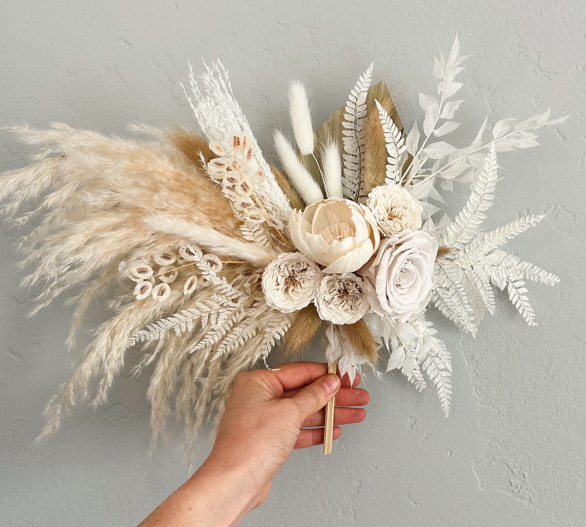Dried everlasting cake topper including pampas grass, preserved roses, palms, sola peony, bunny tail grass.