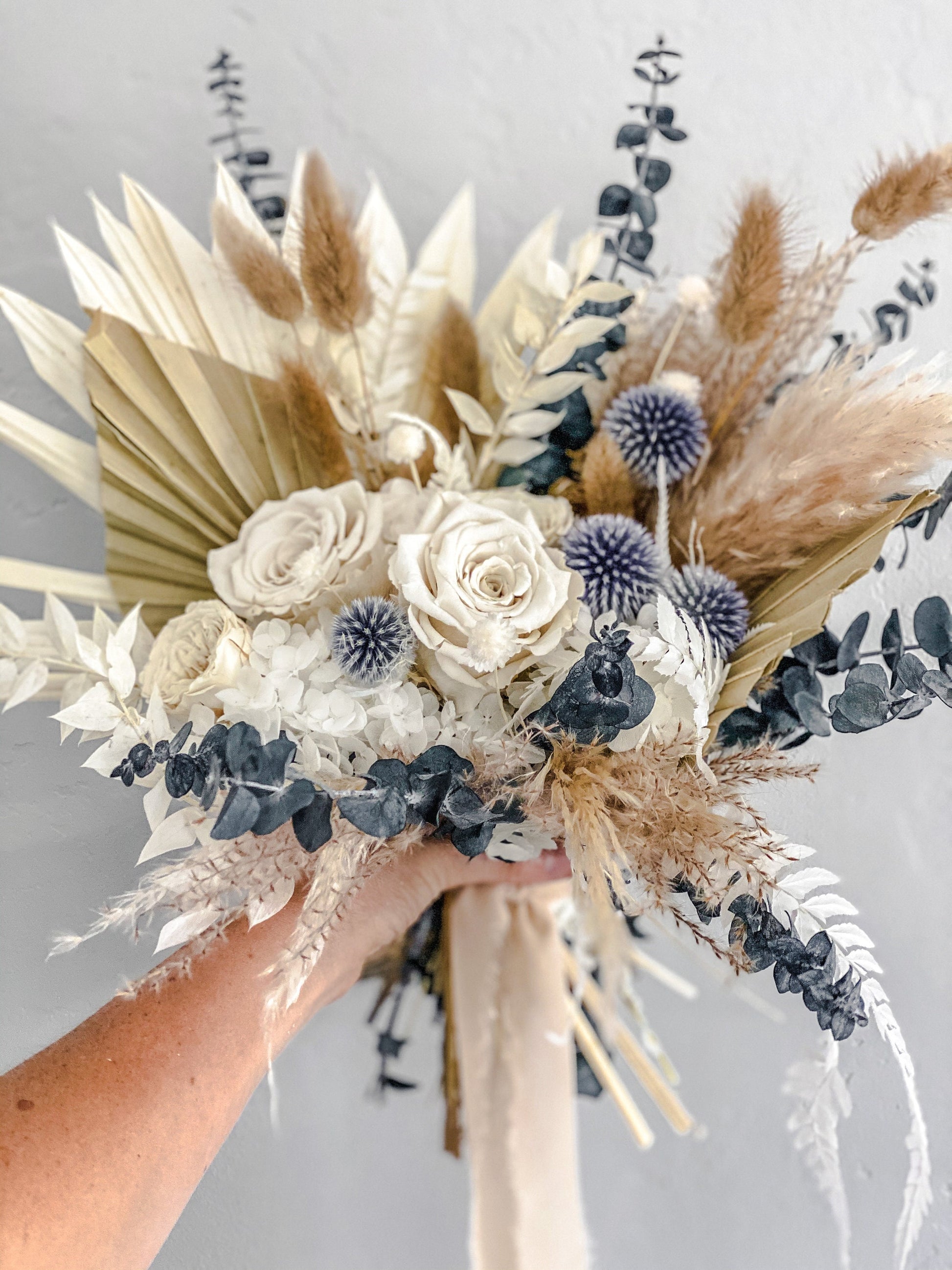 Medium size dried everlasting bouquet including pampas grass, preserved roses, palms, hydrangea, thistle echinops, bunny tail grass. Perfect bridal bouquet, bridesmaids bouquet, or place in vase for home decor. Hand tied with champagne silk chiffon ribbon. Bouquet is approximately 15”x12” wide