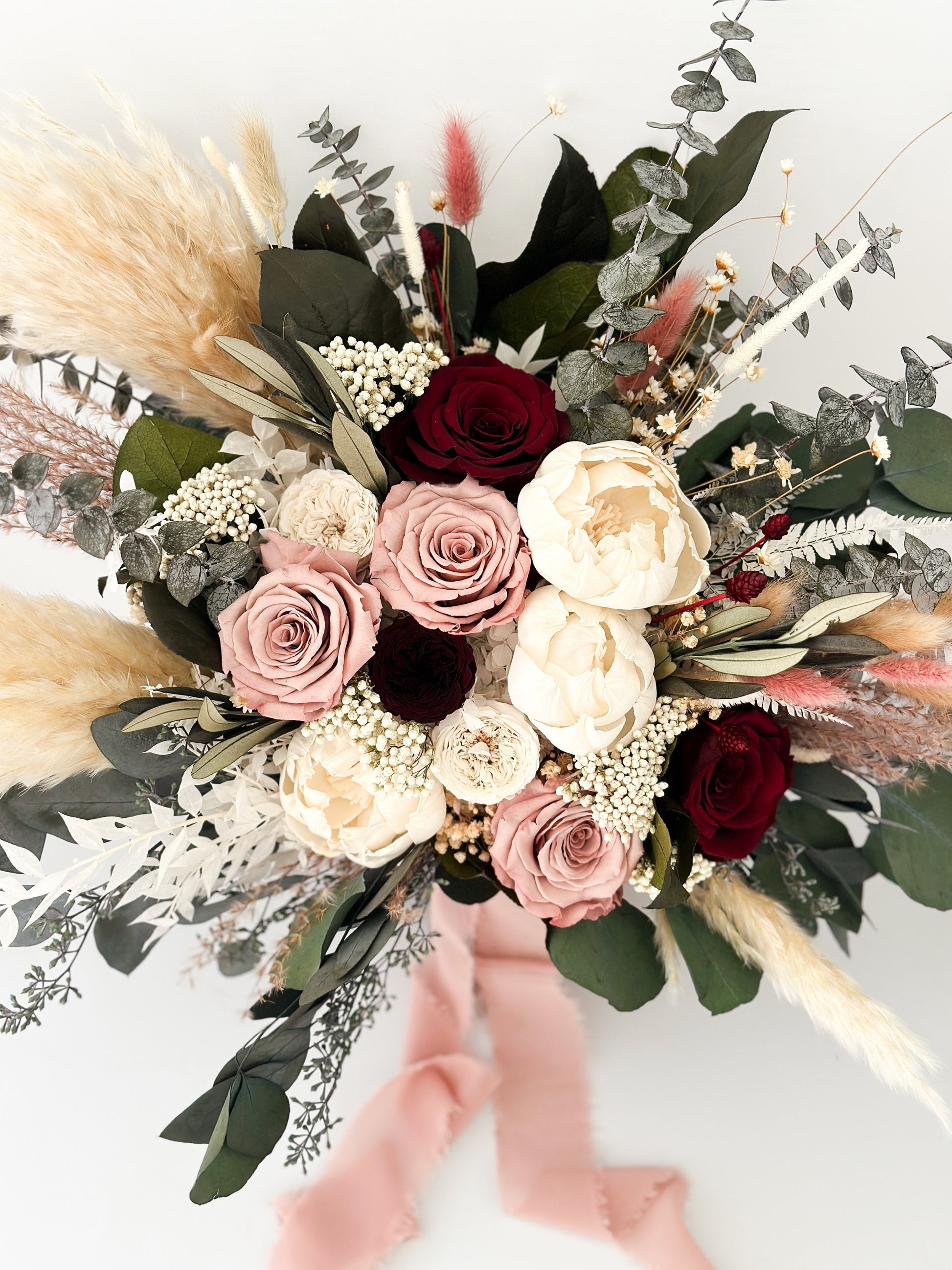 Dried everlasting bouquet including pampas grass, preserved roses, sola wood peonies, hydrangea, eucalyptus, ferns, bunny tail grass. Perfect bridal bouquet, bridesmaids bouquet, or place in vase for home decor. Hand tied with silk chiffon ribbon.