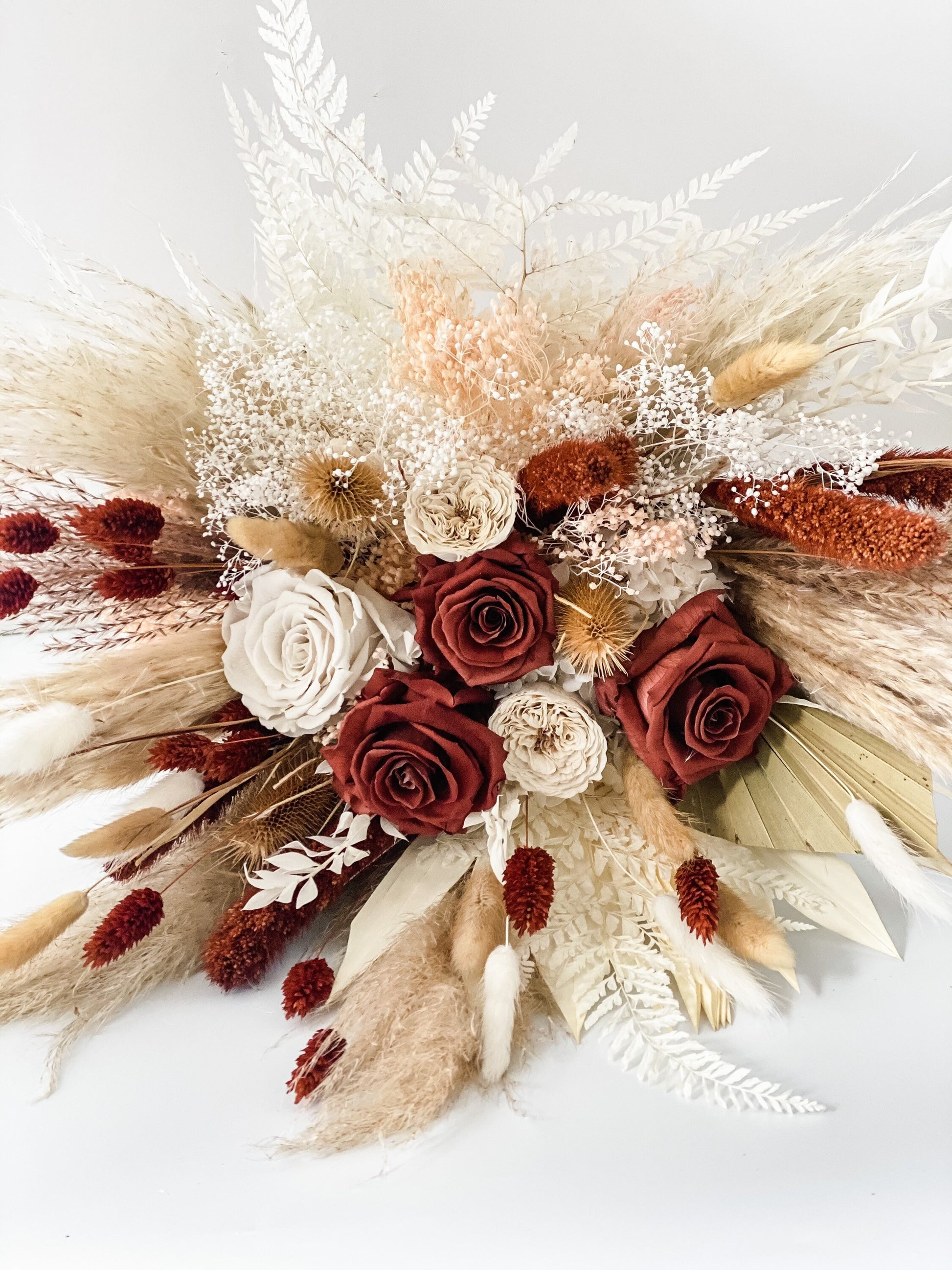 Dried everlasting bouquet including pampas grass, preserved roses, palms, hydrangea, bunny tail grass. Perfect bridal bouquet, bridesmaids bouquet, or place in vase for home decor. Hand tied with silk chiffon ribbon.