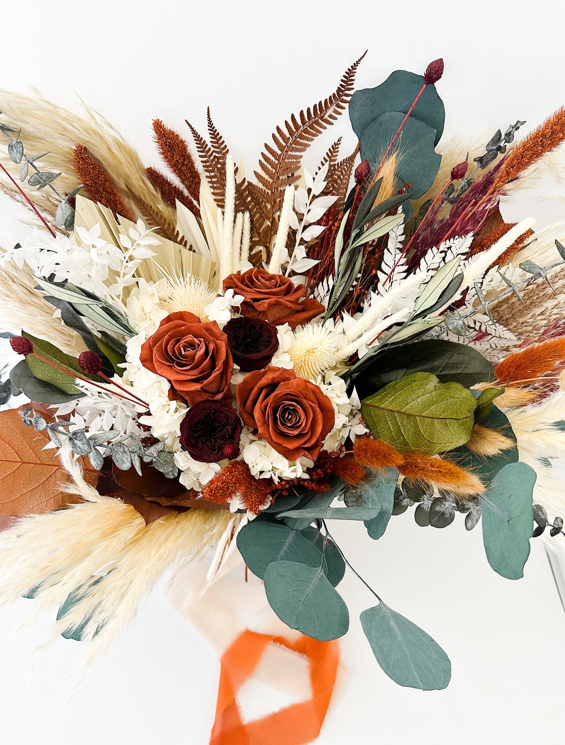 *Each arrangement is handmade with the same components however each of them are arranged slightly different. The colors and size may vary from one to another since they are dried and preserved flowers
