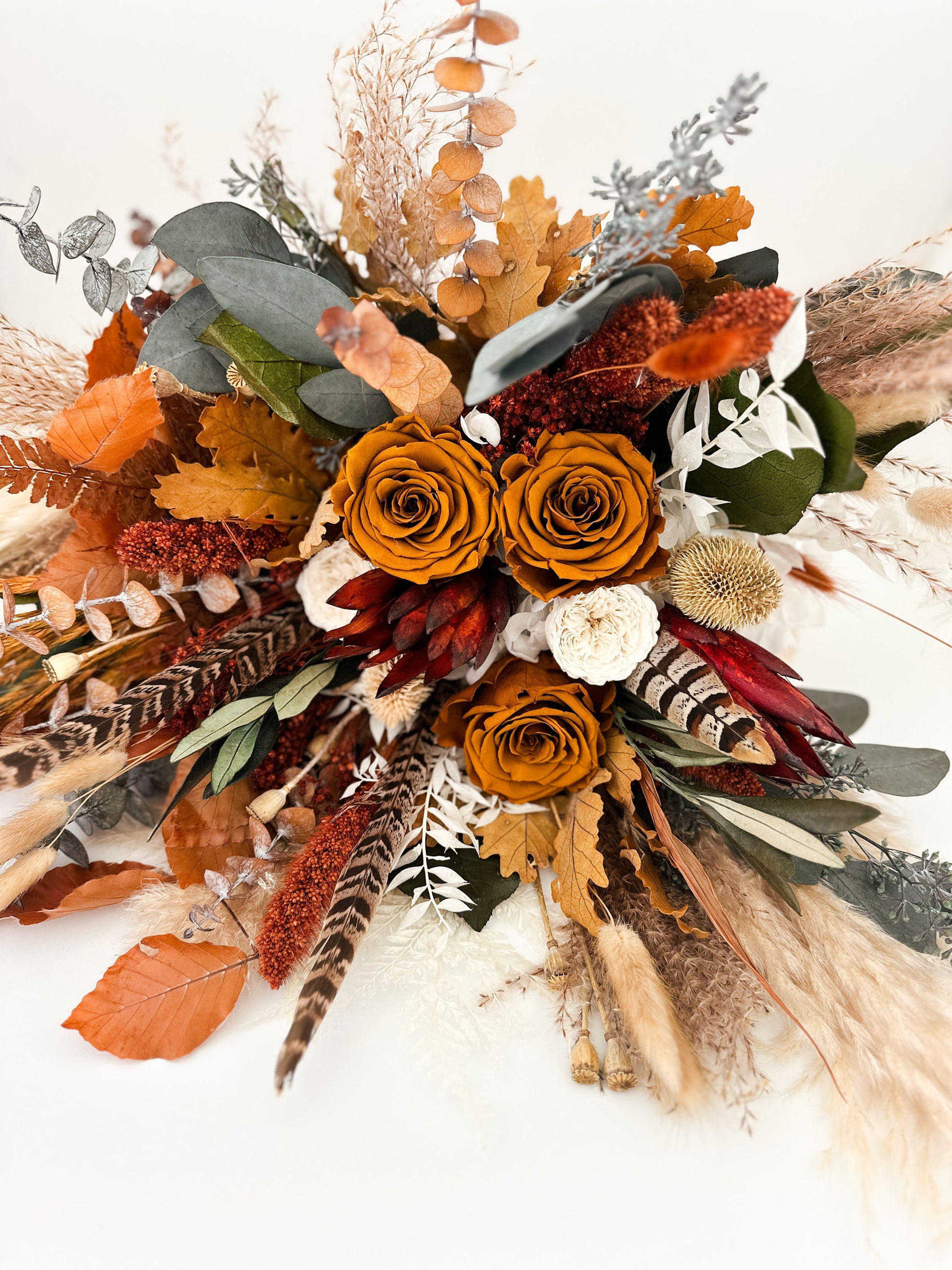 Terracotta, Burnt Orange + Pheasant Feather Dried Flower Bouquet/ Bride and Bridesmaids/ Dried Flower Bouquet/ Wedding Flowers