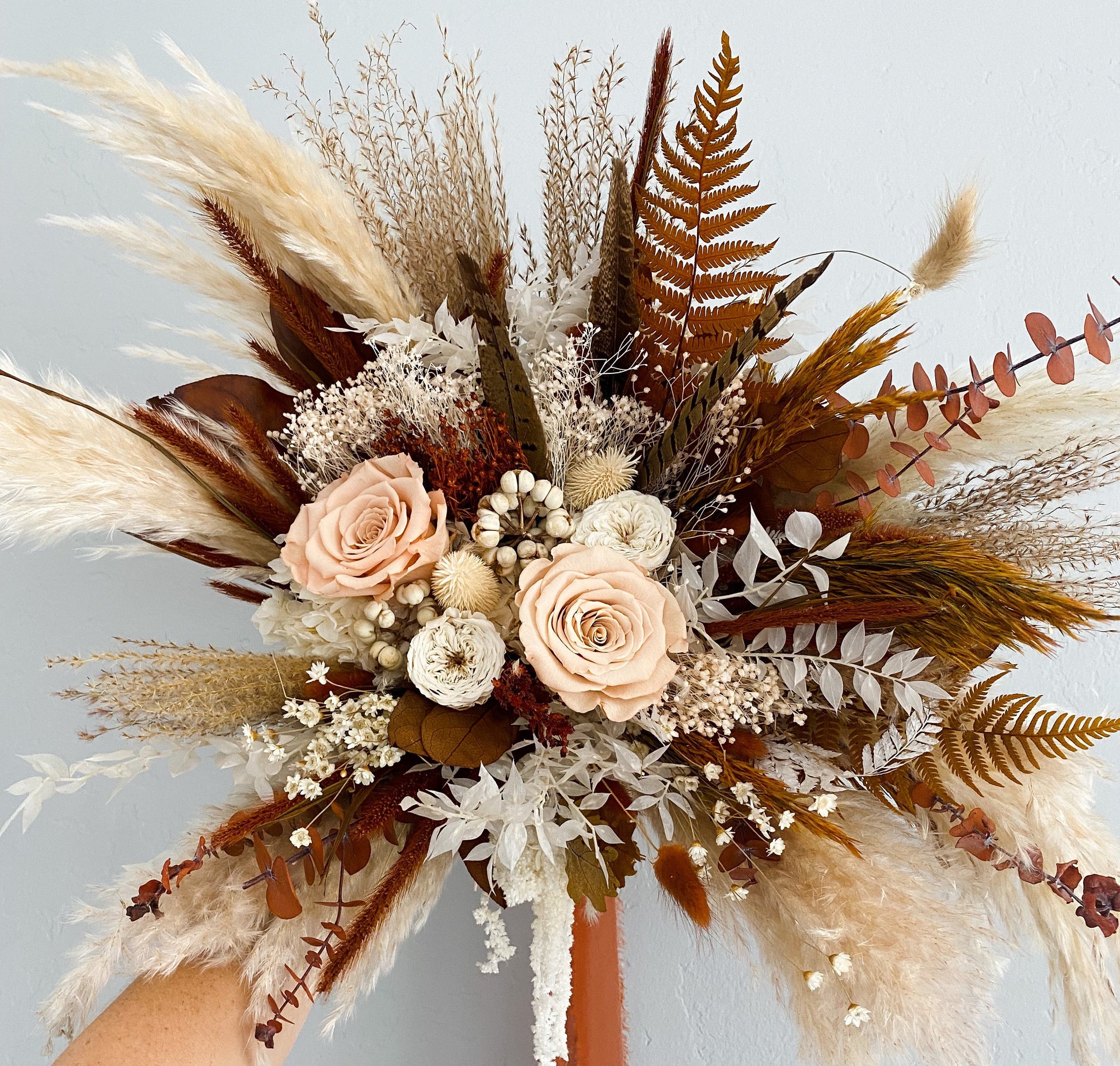 Dried everlasting bouquet including pampas grass, preserved roses, palms, hydrangea, echinops, eucalyptus, bunny tail grass. Perfect bridal bouquet, bridesmaids bouquet, or place in vase for home decor. Hand tied with silk chiffon ribbon.