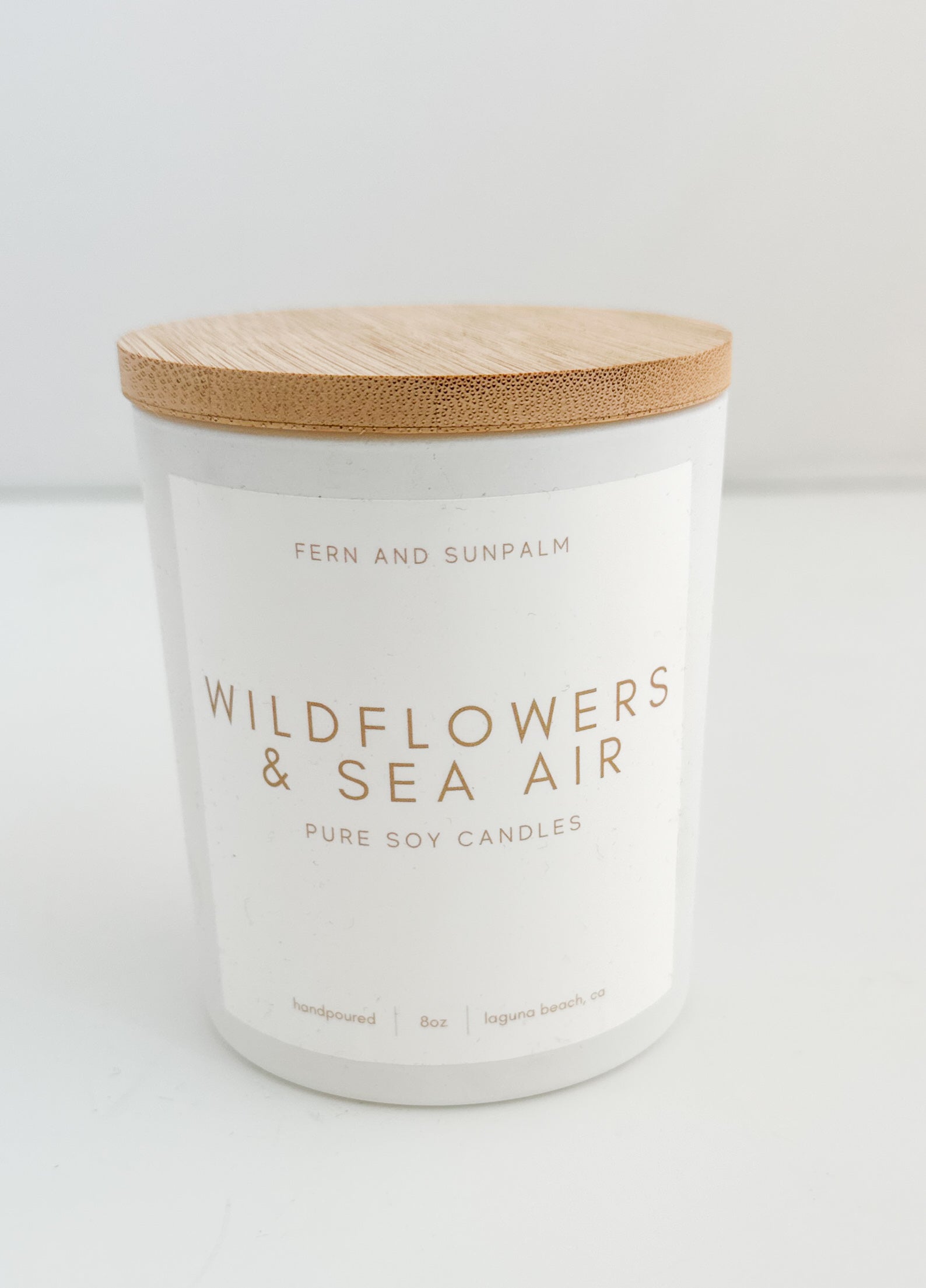 Wildflowers & Sea Air, 8oz handpoured soy candle in white glass vessel with wood lid.